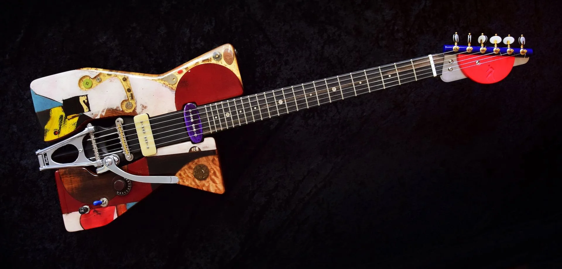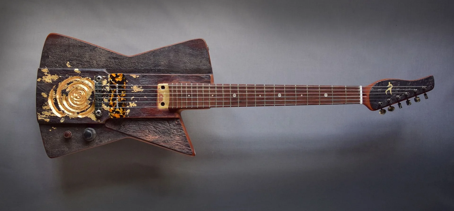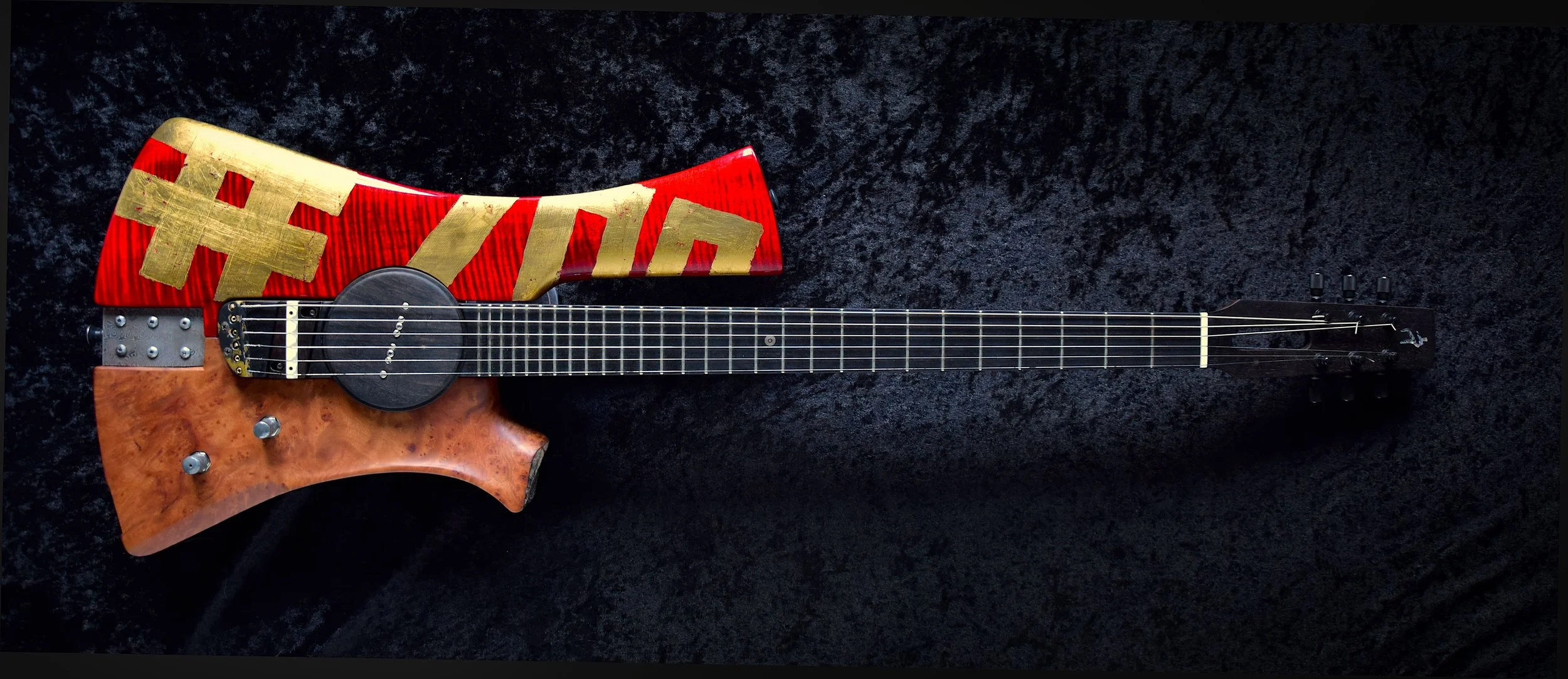 It all started with the headstock, or rather the tuners I acquired as part of a payment for a guitar. They are ornate 6-in-line brass machined and larger than the usual 6-in-line tuners, making for an awkward traditional style headstock. So I tried something else. Using pre-plastic Catalin and a piece of old East German Bakelite mounted on an aluminum base I fashioned a playful assembly with a constructivist vibe, connected to a laminated through-neck of Maple and Padouk. I also wanted to use an Archtop Bigsby I've had for a while and had to find a way to connect it to the neck-through piece. A construction of Ebony and aluminum I call "the lobster" now supports the Bigsby. The flame Mahogany body wings with a "Totem-style" resin top complete this colorful piece.