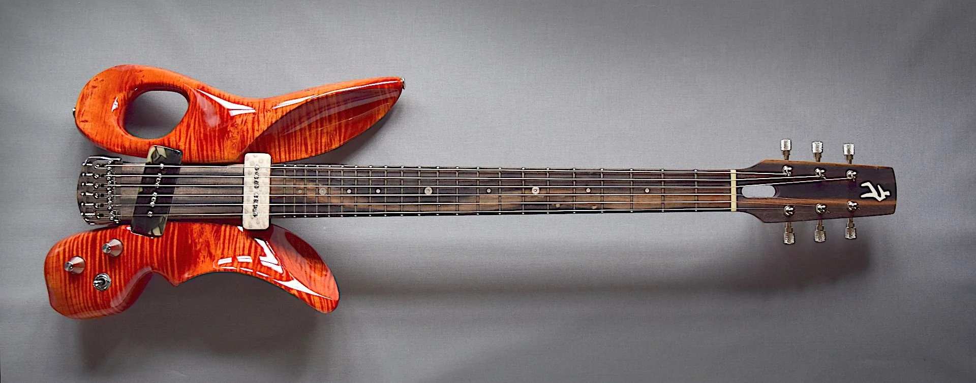 A riff on the modular body style I've used in guitars like "Toshiro's Lady" and the "Twist", this one has a body combining flamed Maple and Thuya burl. They are connected to the solid Rosewood neck-through piece supporting the tuners, the circular Ebony pickup and the tailpiece. A piece of Mokume steel anchors the back end of the body.